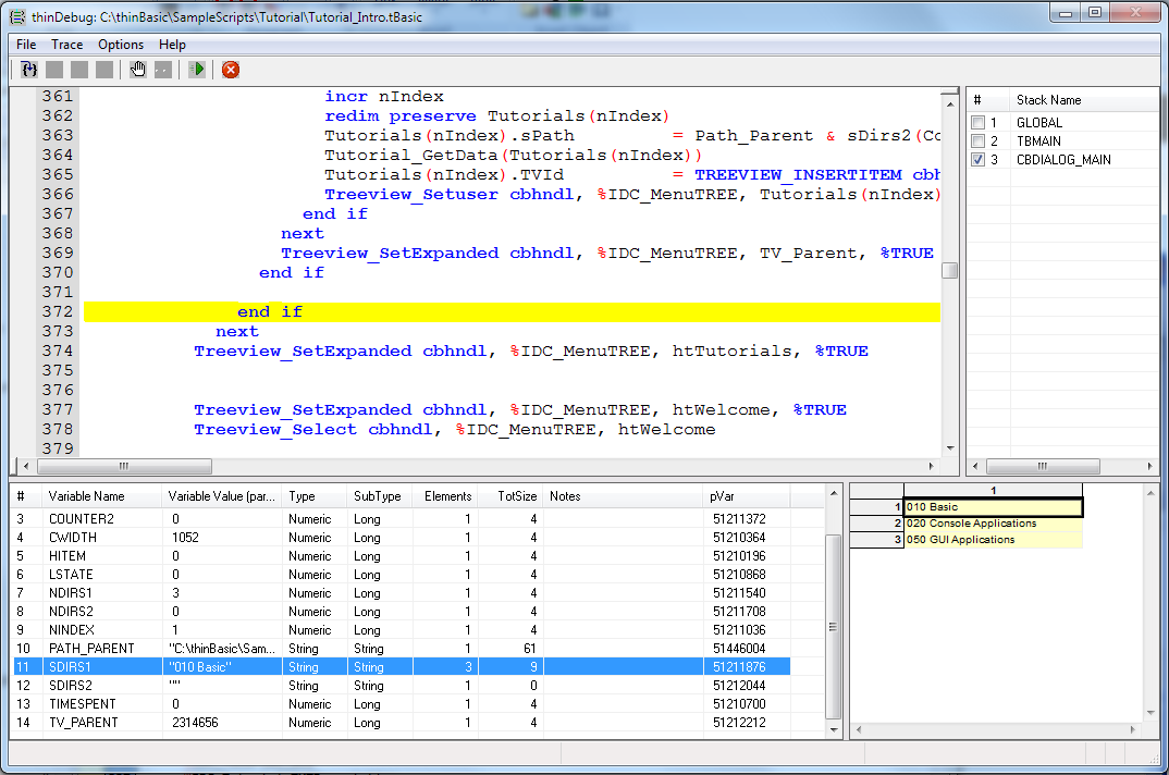 thinBasic has its own debugger called thinDebug. thinDebug has been developed both as integrated application and as module. With thinDebug programmer can control application execution step by step inspecting variables and functions stacks.